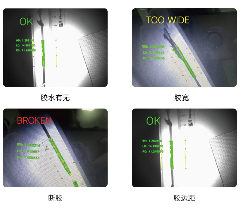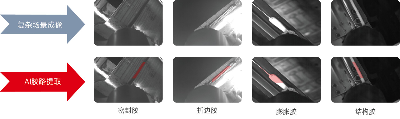 基于CPU运行的轻量化AI胶检,无需增加硬件成本,有效解决反光、胶路颜色不均、背景复杂、低对比度等成像干扰,在多工况下保持成像一致性误差小于0.5mm。